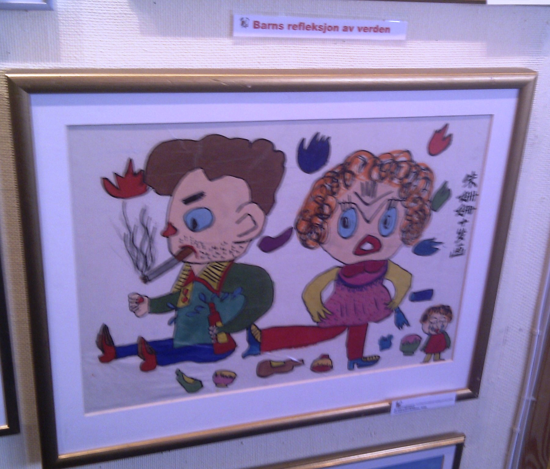 Dette bildet er malt av et barn på 13 fra Japan. Det er fint i seg selv, men blir enda finere hvis man ser det i sammenhengen med det lille skiltet som henger over. I dette barnets tolkning av verden er det liten tvil om at menn er dritt. Skjerp dere.