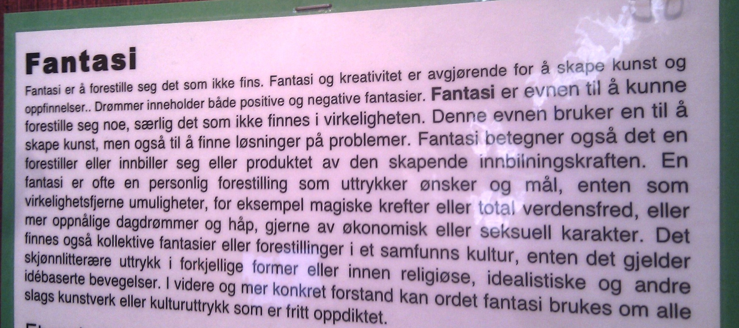 Siden de voksne ikke har fått slått seg løs med egen kunst, hadde de satt opp små informative lapper med forklaringer av begrep. Lurer du for eksempel på hva fantasi er? Jeg også. Og hvis du vil ha svaret, er det ingen grunn til å lese teksten under. Men du kan jo gjøre det fordi den er skrevet på en kreativ måte. Bruken av ulik skriftstørrelse, gjentagelse, fullstendig meningsløse setninger og bastante og drøye påstander, gjør lappen ganske så interessant. Og det var også flott at de fikk blandet inn litt økonomi og sex i det hele.