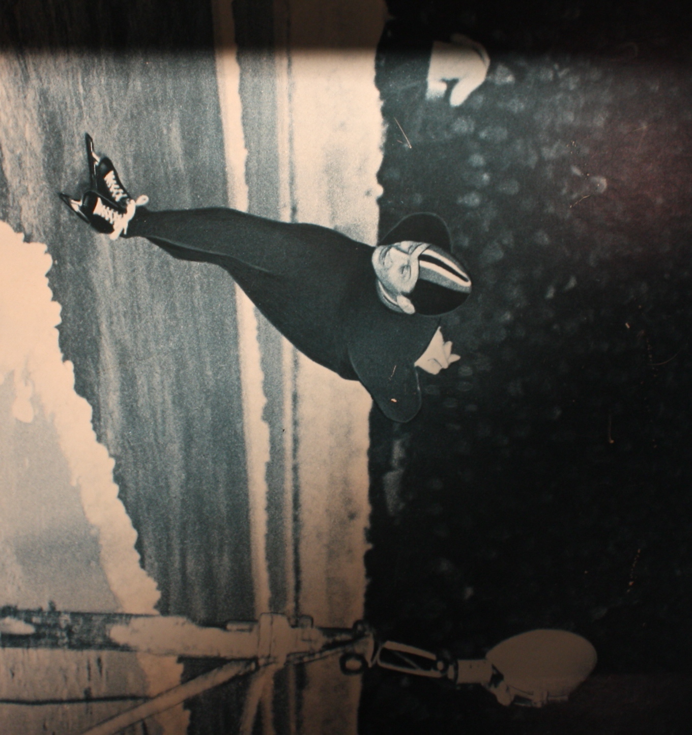 I dag er Hjalmar Andersen 89 år og han kommer fortsatt innom museet innimellom, ifølge museumsmannen. Og ikke nok med at han er en blid trønder, han vant medaljer i fleng også. I 1951 vant han til og med EM på lånte skøyter, etter en litt for ivrig fotograf blendet ham med blitsen sin under løpet, så Hjallis tryna og ødela skøytene sine. Her er bildet, og sekunder etter ligger han og spreller på isen: