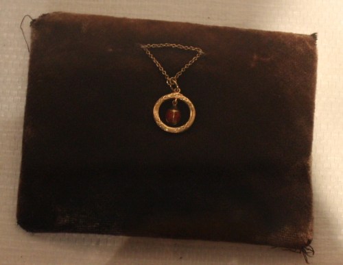 Rett før jeg skulle til å gå fra museet kom museumsmannen og sa at han ville vise meg noe. Han tok meg med bort til denne lille puten med et smykke på: