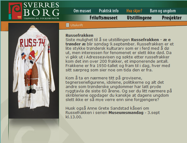 La oss først slå fast at det der er det beste utstillingsnavnet noensinne. MEN: Er russefrakken i ferd med å dø ut?! Hva er det som skjer! Frakken bør sørenmeg ikke byttes ut med noe som helst med motor. Ser jeg en russebuss i Trondheim skal jeg personlig gjøre mitt beste for å tilintetgjøre den. Med en kjempeskarp penn, for eksempel. Men alvorlig talt, hvorfor vil ikke trønderrussen lenger ha frakk (pledd, sitteunderlag, sovepose og notatblokk i ett og samme plagg!)? Og hvorfor har jeg ikke fått med meg den utstillingen her? Og hvorfor har ingen av trønderne jeg kjenner dratt på utstillingen og gitt meg grundig referat med tekst, bilder og video? Du har frem til 9. september, og det er jo masser av tid! Trykk her for mer utstillingsinfo. Kom igjen, da. For min skyld! (alt jeg trenger er et par dårlige mobilbilder og noen setninger om utstillingen).