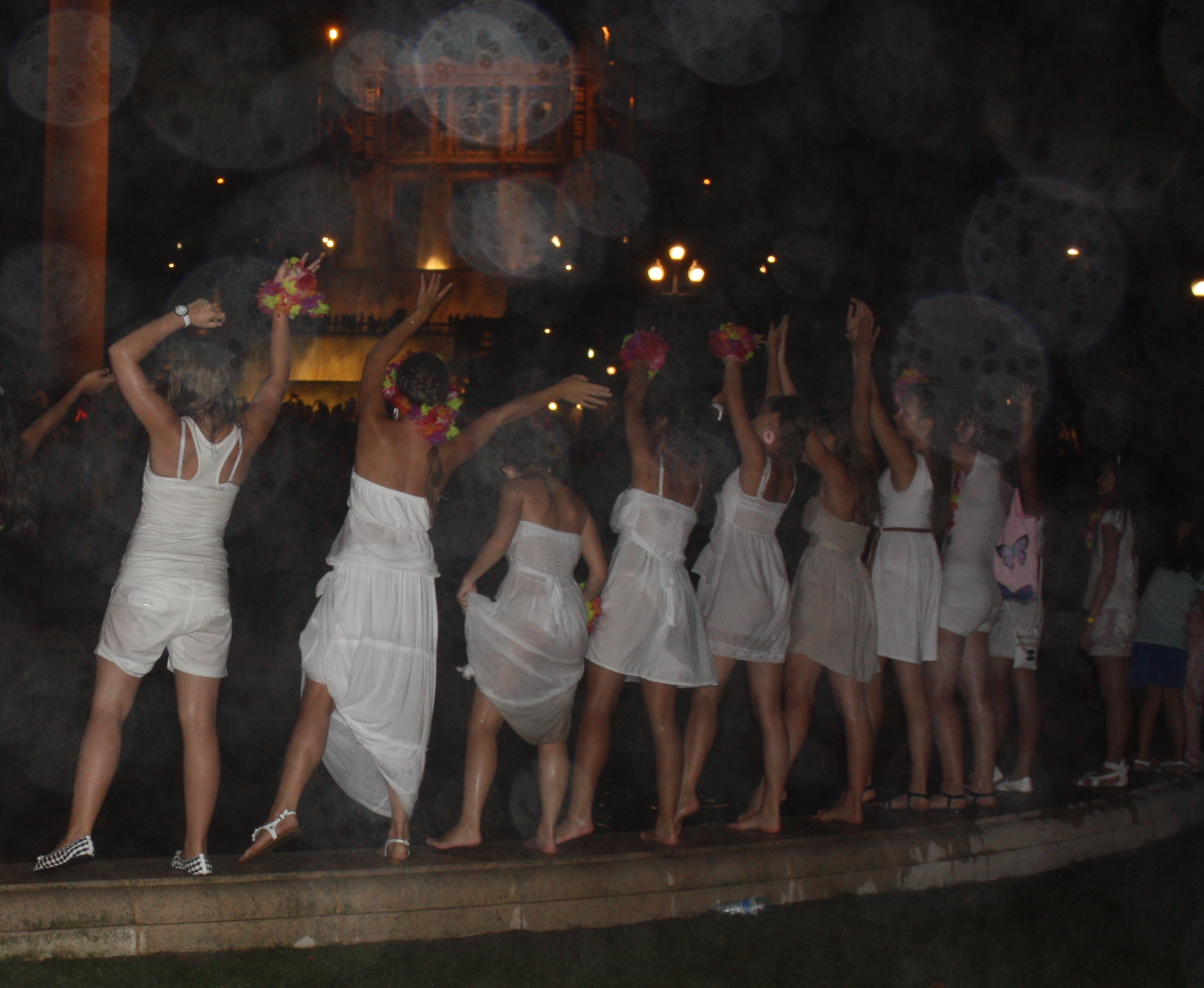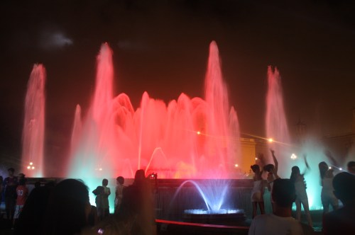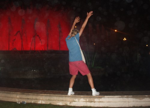 Og ja, du må snu hodet. Det tåler du. Men hørte du sangen? Det var Timbaland og One Republic’s Apologize. Og det stoppet ikke der. Everybody, Wonderwall, Thriller og Smells Like Teen Spirit er bare et utvalg av slagerne som dundret ut av høyttalerne mens vannet sprutet og folket jublet. Men vi kan more oss med folket, vi. Og hjelpes så mange det var av dem. I tillegg til jubel, musikk og folkemasser hadde den lokale danseskolen oppvisning på fontenekanten. Vi slang oss med, siden stemninga ble så god av all den flotte musikken og sprutende neonfarget vann. Jentene hadde valgt hvite kjoler for anledningen, noe som er et flott valg siden de var ca 12 år og sto rett ved sprutende vann. Så takk til Rosa og Eirik for tipset om fonteneshow med klassisk musikk, men vi må nok ta oss en liten prat om musikk når vi kommer tilbake.