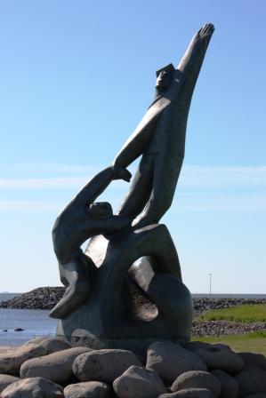 I dag var jeg tilbake på samme sted, og det var selvfølgelig ikke en maurslukerstatue. Nånei, du. Hvis man ser den i en annen vinkel og i dagslys, viser det seg at det er en løftestatue det også. Her er altså bevis nr. 73 (ca.?) på at islendinger elsker statuer hvor de løfter hverandre.